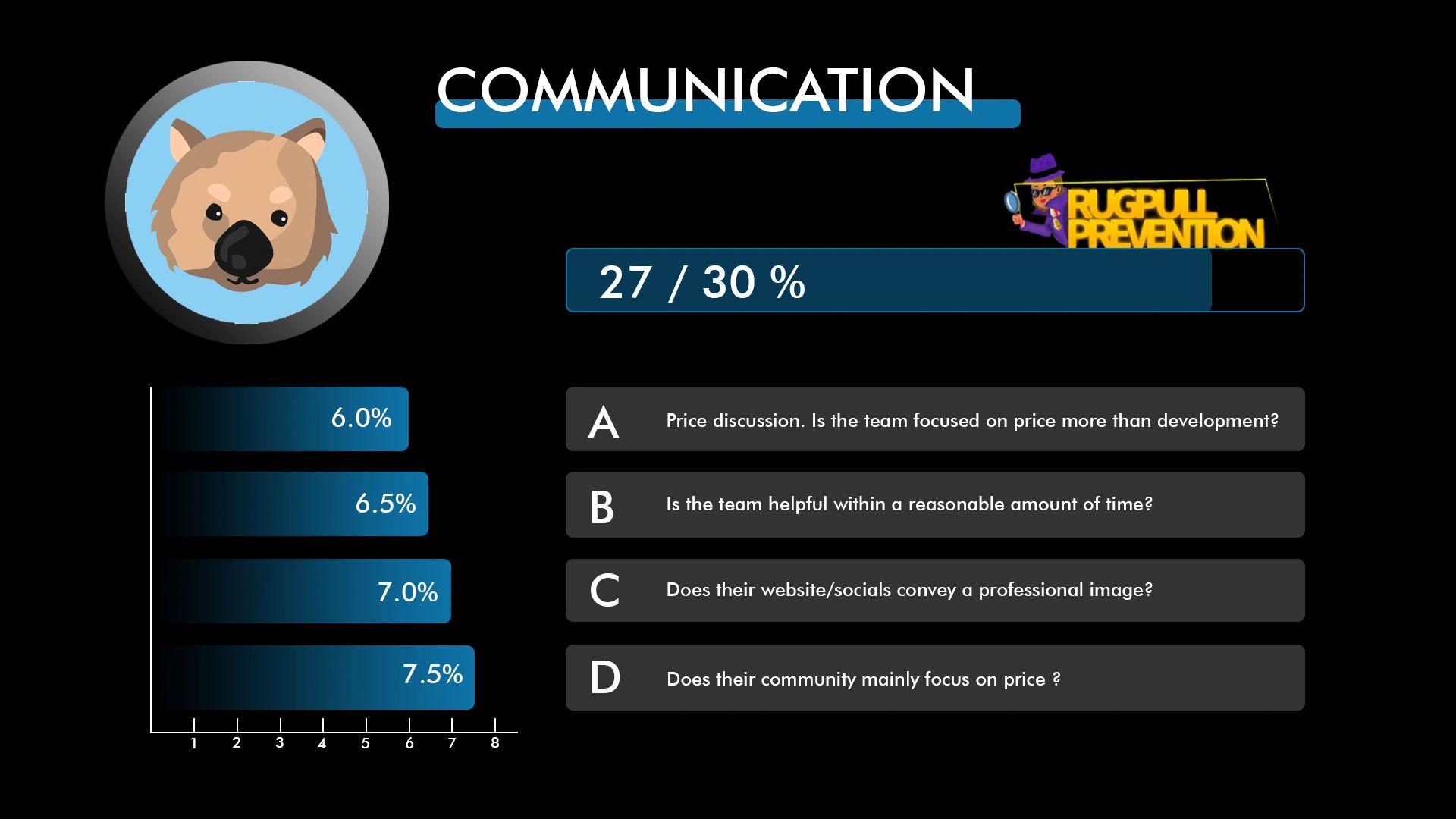 10% will be subtracted from scores if there is Censorship happening in the project's communities. Rugpull Prevention is against censorship. Criticisms should be met with intelligent debate, not censorship. Obviously, there is always a need for moderation and to ban and remove some inappropriate content, lies, FUD.